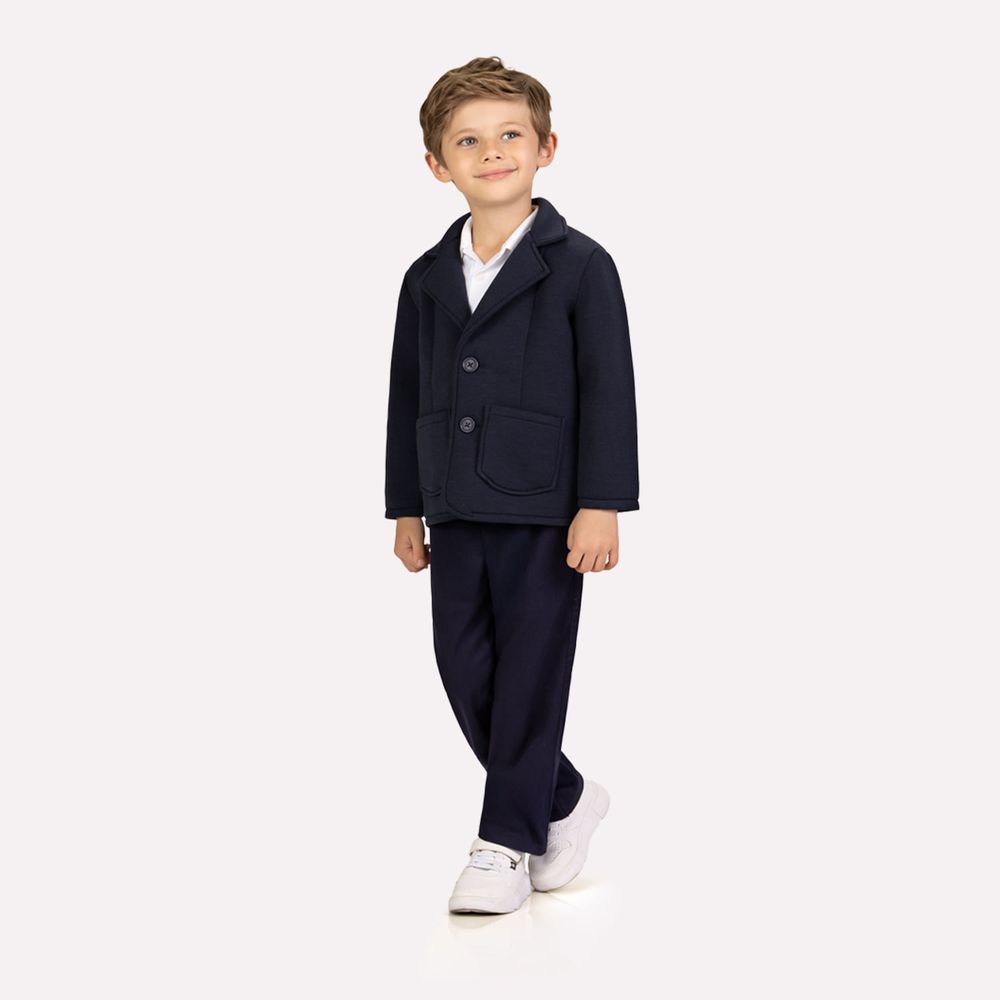 Confeccionado em neoprene com composição de 80% poliéster, 15% viscose e 5% elastano, o tecido apresenta estrutura encorpada, toque macio e leve elasticidade, proporcionando excelente caimento e liberdade de movimento para o menino. A modelagem é clássica, levemente ajustada ao corpo, com construção que valoriza a postura e garante visual refinado sem comprometer o conforto. O forro interno em 100% poliéster facilita o vestir e contribui para um acabamento interno impecável.