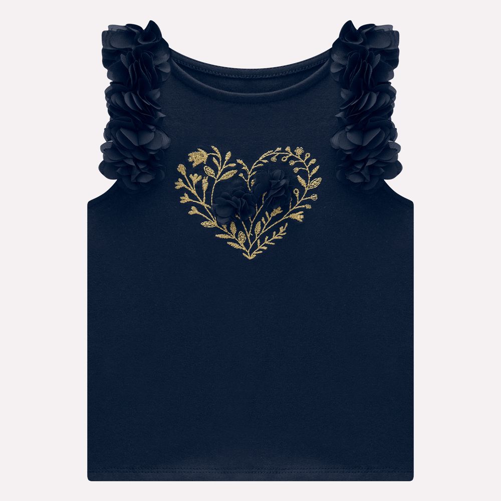 O destaque da peça está nos acabamentos especiais, com o bordado em formato de coração com flores na parte frontal traz um ar romântico e encantador, enquanto o aviamento de flores aplicadas ao redor das cavas adiciona ainda mais charme e delicadeza. A modelagem é prática e fresquinha, ideal para dias ensolarados, e o decote redondo com acabamento reforçado garante conforto extra. Uma peça sofisticada, versátil e cheia de graça, perfeita para compor desde looks casuais até produções mais arrumadinhas, sempre com a delicadeza e o cuidado característicos da Milon.