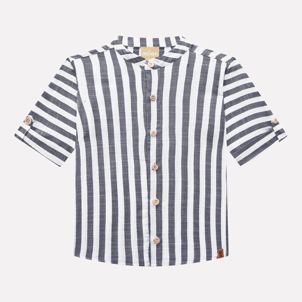 A Camisa Infantil Menino Milon é uma peça sofisticada e confortável, feita em tricoline fio tinto com 57% viscose e 43% algodão, e apresenta listras neutras atemporais. Com gola padre e martingale nas mangas, ela proporciona um toque moderno e sofisticado. As mangas podem ser dobradas na barra, e a abertura frontal é feita por botões, com uma etiqueta decorativa da marca Milon, adicionando um toque de exclusividade à peça. Ideal para ocasiões especiais, essa camisa une estilo e elegância de forma impecável.