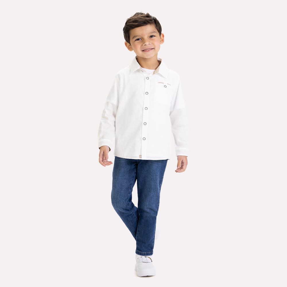A gola estruturada reforça a elegância da peça, enquanto a abertura frontal com botões garante praticidade ao vestir. O bolso aplicado no peito, com detalhe sutil de acabamento, adiciona um ponto de estilo contemporâneo sem perder a essência clássica. Os punhos com fechamento em botão completam o design com precisão e acabamento cuidadoso. Ideal para compor looks de festa, cerimônias e ocasiões formais, essa camisa infantil masculina combina perfeitamente com calças de alfaiataria, sarja ou jeans escuro. Um clássico Milon que une qualidade premium, conforto e sofisticação para momentos especiais.