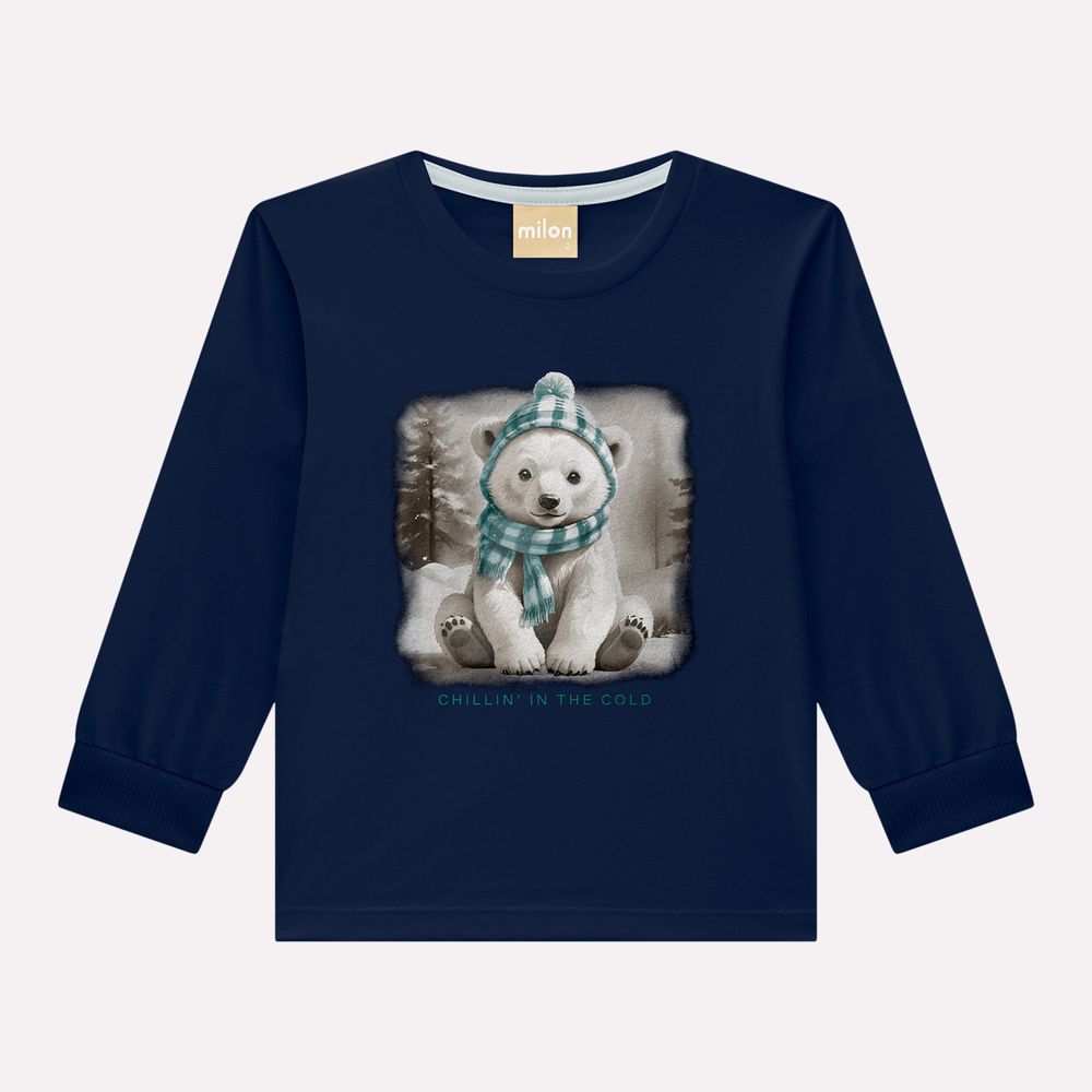 Um convite carinhoso para os dias mais frescos, a camiseta infantil menino Milon envolve a rotina com aconchego e personalidade. Inspirada no universo lúdico dos bichinhos, a peça traz estampa de urso polar com efeito delicadamente iluminado e lettering moderno, criando uma composição charmosa e cheia de imaginação para o menino que adora explorar o mundo com estilo.