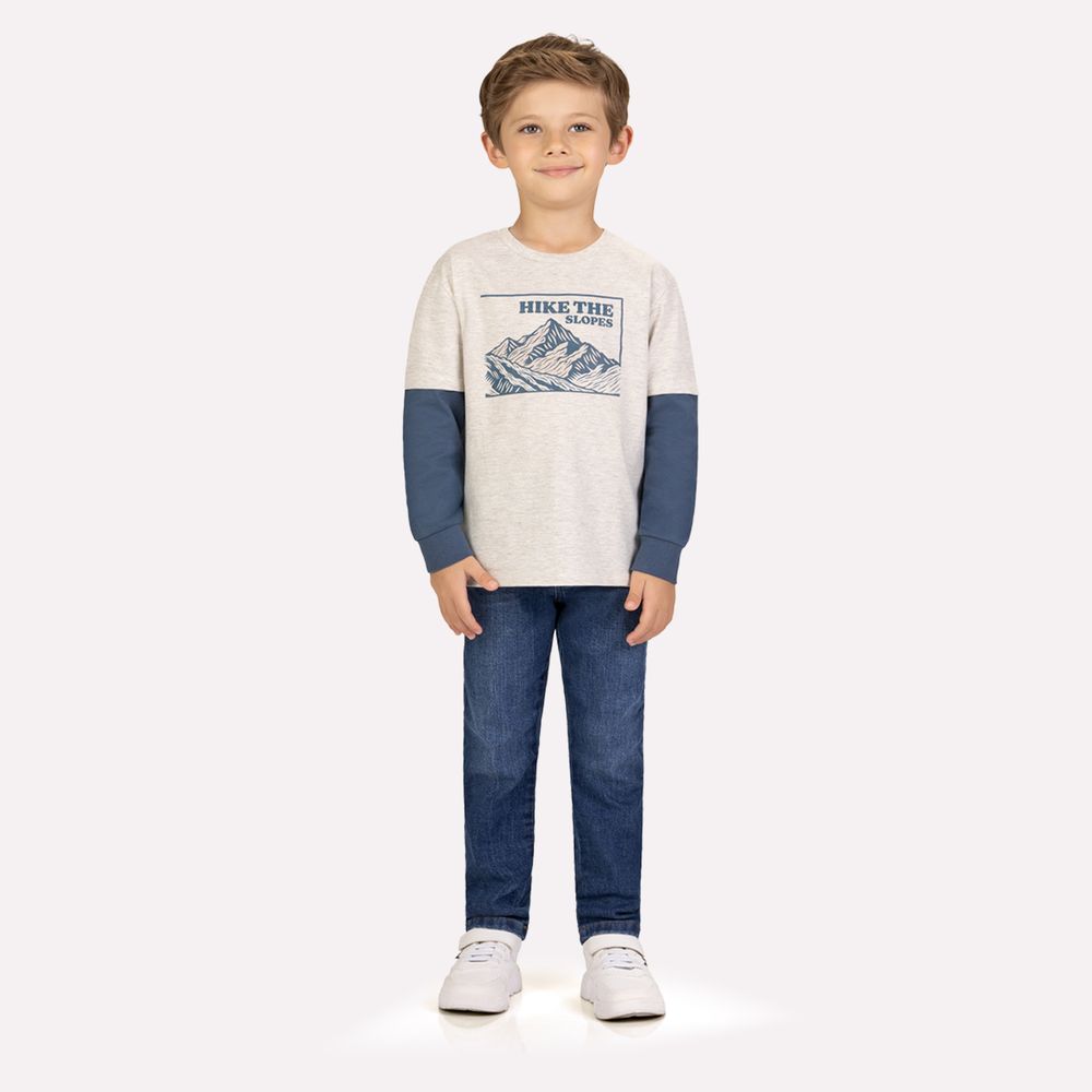 Inspirada no espírito aventureiro e na beleza das paisagens naturais, a camiseta infantil menino Milon traduz o encanto das montanhas em uma proposta moderna e cheia de personalidade. A estampa localizada com ilustração de montanha e lettering cria um visual autêntico, perfeito para o menino que transforma cada passeio em uma grande descoberta. Confeccionada em meia malha, o corpo em 98% algodão e 2% poliéster apresenta leve efeito mesclado, toque macio e excelente respirabilidade, garantindo conforto durante todo o dia. As mangas em 100% algodão contrastam suavemente com o corpo da peça, valorizando o design e proporcionando ainda mais suavidade ao vestir. A modelagem reta oferece caimento equilibrado e confortável, permitindo liberdade de movimentos com estrutura bem definida.