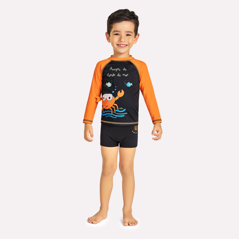 Um mergulho cheio de diversão e estilo! A blusa infantil menino Milon é confeccionada em tecido microway, 90% poliéster e 10% elastano, que garante proteção solar, toque macio e secagem rápida, perfeita para acompanhar os pequenos nos dias de praia e piscina. O design é alegre e moderno, com mangas longas em tom vibrante de laranja que contrastam com a frente preta, destacando a estampa exclusiva de caranguejo divertido acompanhado de peixinhos. O charme extra fica por conta do aplique interativo com lettering, que traz um toque lúdico e especial à peça.