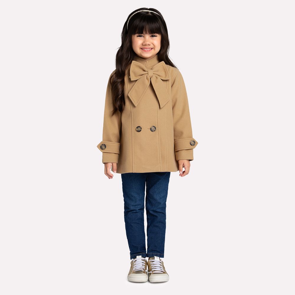 O grande destaque dessa peça é o laço removível na parte frontal, que adiciona um charme delicado e pode ser facilmente retirado, oferecendo ainda mais versatilidade ao casaco. Com isso, a criança pode criar diferentes combinações e explorar novas opções de looks. Os botões duplos conferem um acabamento refinado, complementando a estética sofisticada da peça e adicionando funcionalidade ao design.