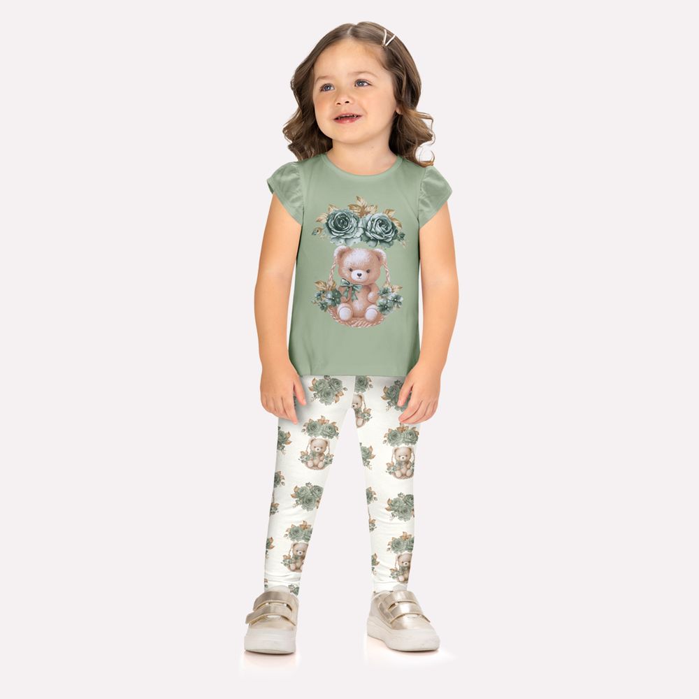 Legging, confeccionada em 94% algodão e 6% elastano, que garante elasticidade e ajuste suave ao corpo. Estampa rotativa de ursinhos com flores. A cintura com elástico rebatido proporciona segurança e conforto durante o uso, ideal para acompanhar as pequenas em seus momentos de brincadeira e movimento. Este conjunto é a escolha perfeita para vestir com delicadeza e conforto.