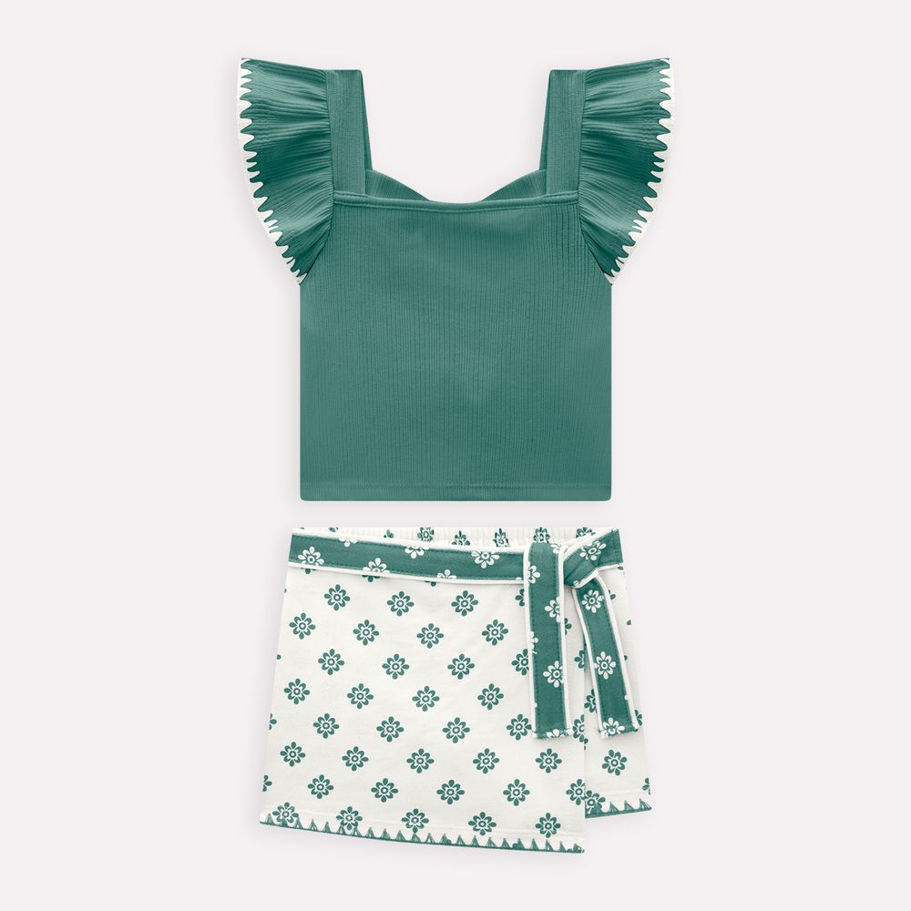 O short-saia, feito em moletinho 100% algodão, une a praticidade do short ao charme da saia, com modelagem soltinha e confortável. Possui estampa rotativa de flores e barra finalizada com ponto concha, além de cós com aplicação de fita lateral para amarração, que garante ajuste perfeito e um toque decorativo encantador. Um conjunto leve e versátil, ideal para passeios, eventos casuais e momentos especiais, vestindo a pequena com elegância e suavidade.