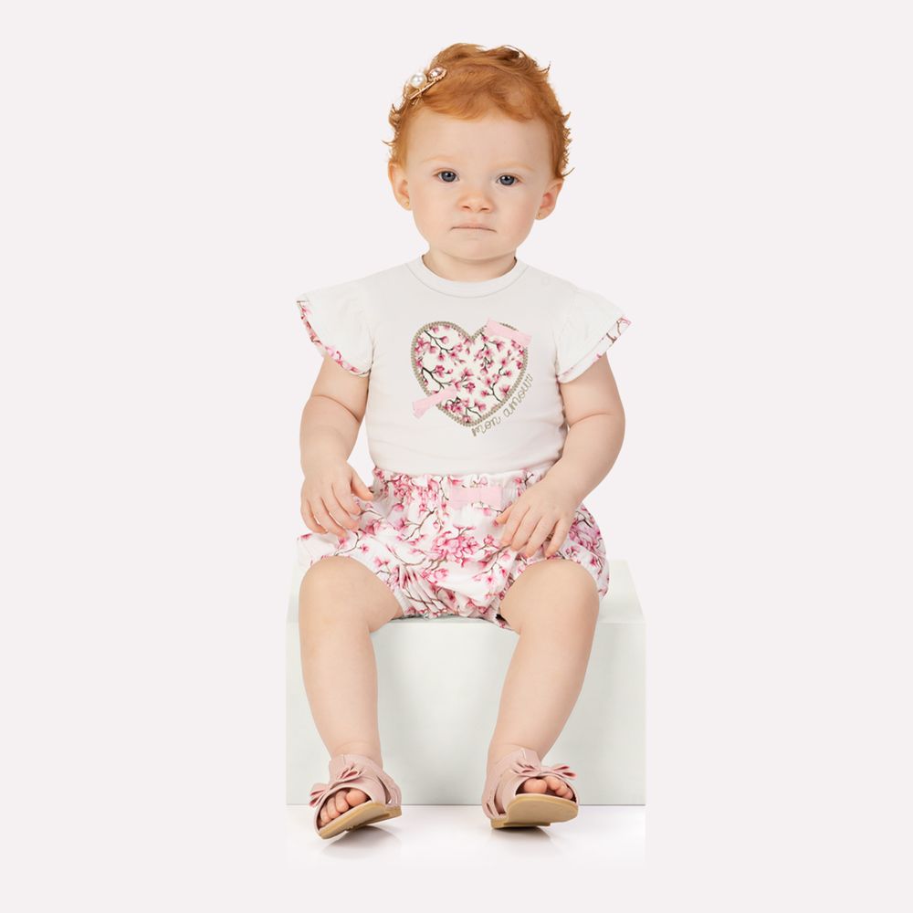 O body, confeccionado em cotton 95% algodão e 5% elastano, tem toque macio e modelagem ajustada, garantindo liberdade de movimento e conforto durante todo o dia. Ele se destaca pelo bordado em forma de coração com estampa deflores e lacinho aplicado, que transmite toda a ternura da infância. As mangas franzidas com babadinhos delicados trazem um ar romântico e gracioso, enquanto o fechamento por botões de pressão facilita o vestir e trocar.