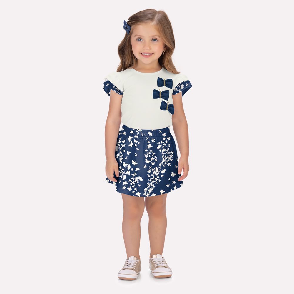 A saia, também em cotton, apresenta uma linda estampa rotativa de borboletas, que harmoniza perfeitamente com a blusa. Além disso, o modelo conta com short interno 100% algodão, oferecendo praticidade e liberdade para brincar com segurança. O cós com elástico proporciona ajuste perfeito e conforto extra. Com cores suaves, detalhes caprichados e modelagem confortável, esse conjunto é ideal para momentos especiais e cheios de alegria!