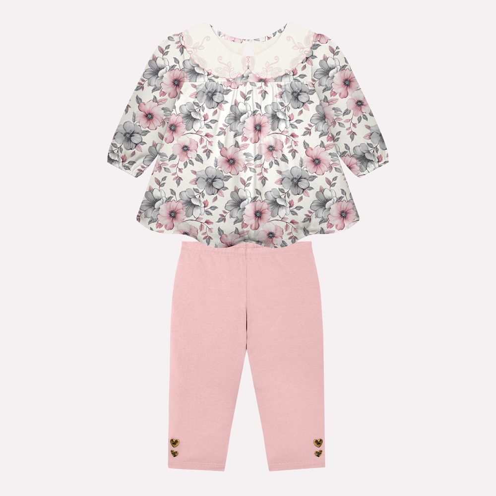 A legging em cotton, composta por 94% algodão e 6% elastano, complementa o conjunto com ajuste confortável e flexível. A peça lisa equilibra o visual com suavidade e possui pequenos botões decorativos na barra que adicionam um toque delicado ao look. Perfeito para passeios e momentos especiais, o conjunto bebê menina Milon combina conforto, delicadeza e um visual flores encantador.