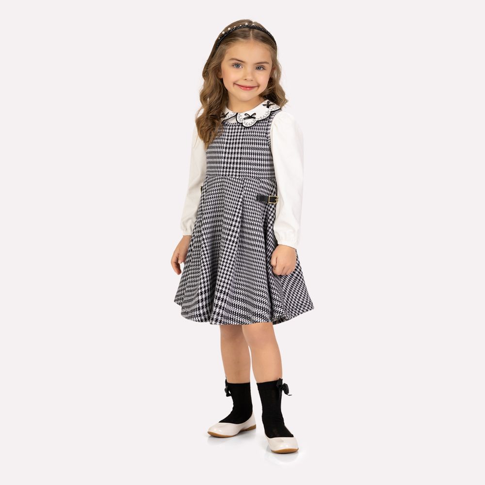 Encantador e elegante, este conjunto infantil menina Milon traduz um estilo clássico com detalhes delicados que tornam o look ainda mais especial. A combinação da blusa bordada com o vestido em jacquard cria uma produção sofisticada, perfeita para ocasiões que pedem charme e delicadeza.