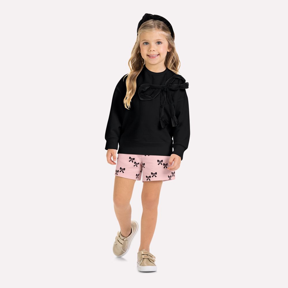 O short complementa o conjunto com estampa rotativa de pequenos laços, criando uma harmonia delicada com o detalhe do casaco. A modelagem confortável com cós elástico proporciona ajuste perfeito e liberdade de movimentos, ideal para acompanhar as atividades do dia a dia. Charmoso e versátil, o conjunto infantil menina Milon é perfeito para compor looks confortáveis e elegantes, trazendo um visual moderno, delicado e cheio de personalidade.