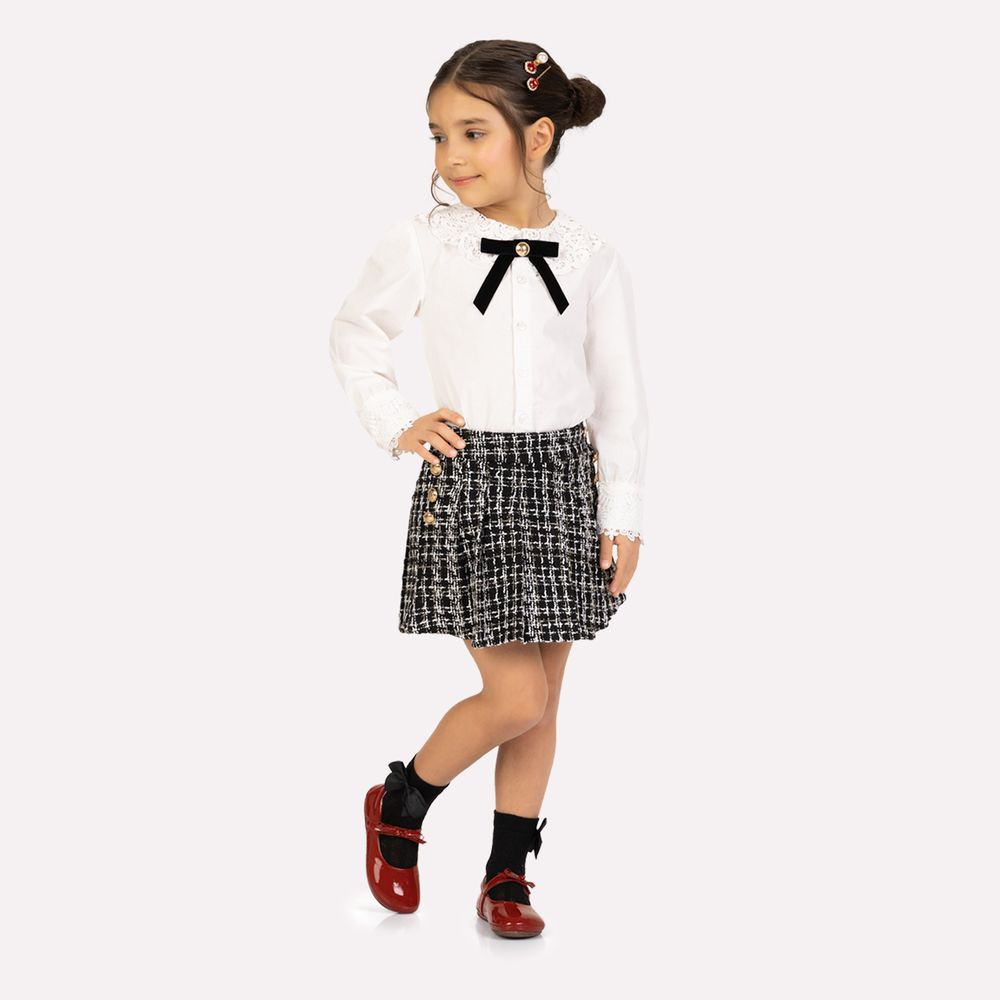 A saia é confeccionada em tweed com composição de 70% poliéster, 15% algodão, 10% viscose e 5% outras fibras, trazendo textura sofisticada e estrutura elegante à peça. O forro interno em 90% algodão e 10% poliéster garante conforto ao contato com a pele. A modelagem apresenta caimento estruturado com leve abertura, proporcionando movimento delicado e visual alinhado. Os botões decorativos aplicados na parte frontal acrescentam charme e reforçam o estilo clássico da peça. Ideal para festas, eventos especiais e ocasiões elegantes, este conjunto infantil menina Milon combina delicadeza, conforto e acabamento sofisticado em um look encantador para a menina.