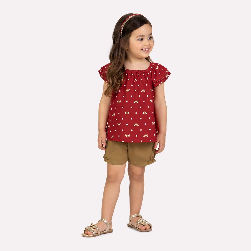 A parte inferior é composta por um short liso, com modelagem confortável e cós com elástico, que se adapta facilmente ao corpo infantil sem apertar. O corte é levemente soltinho, garantindo bem-estar durante todo o dia e permitindo combinações equilibradas com a blusa estampada. Os acabamentos são delicados e reforçam o cuidado característico da marca Milon. Um conjunto que une sofisticação, funcionalidade e delicadeza, perfeito para compor looks charmosos e confortáveis para diversas ocasiões.