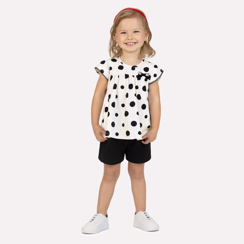 A parte superior é uma blusa em cotton, confeccionada em 95% algodão e 5% elastano, garantindo toque extremamente macio, respirabilidade e elasticidade na medida certa. A modelagem é levemente evasê, com recorte abaixo do busto que cria um caimento solto e gracioso. As mangas com picueta adicionam volume delicado e movimento à peça, enquanto a estampa de póas traz um visual elegante e equilibrado, valorizando o design com suavidade e leveza.