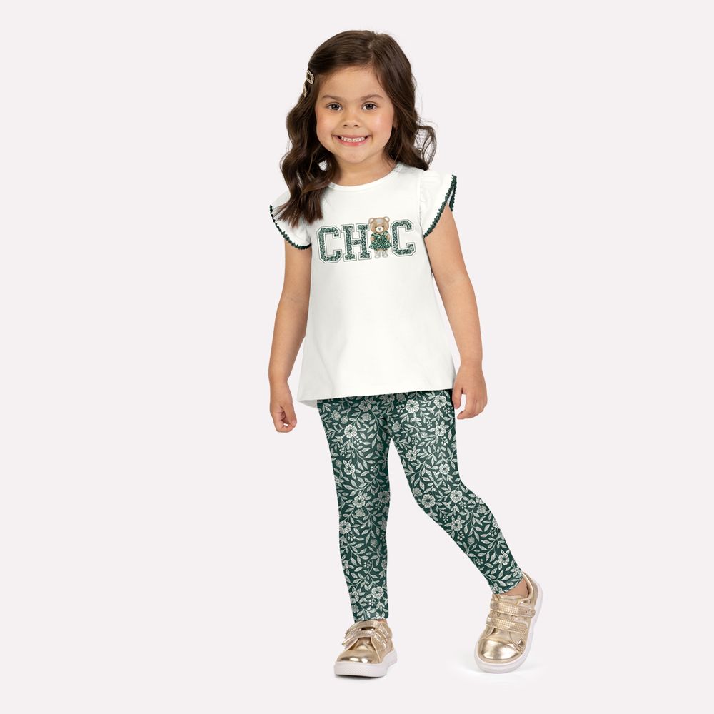 A parte inferior é uma legging em cotton, composta por 94% algodão e 6% elastano, garantindo ajuste confortável ao corpo infantil e total liberdade de movimentos. A modelagem é justa na medida certa, acompanhando as pernas com suavidade. A estampa rotativa de flores e folhas aparece de forma harmoniosa por toda a peça, criando contraste elegante com a blusa e mantendo o visual leve e sofisticado. Um conjunto versátil e delicado, ideal para o dia a dia, unindo conforto, modelagem cuidadosa e detalhes que fazem toda a diferença.