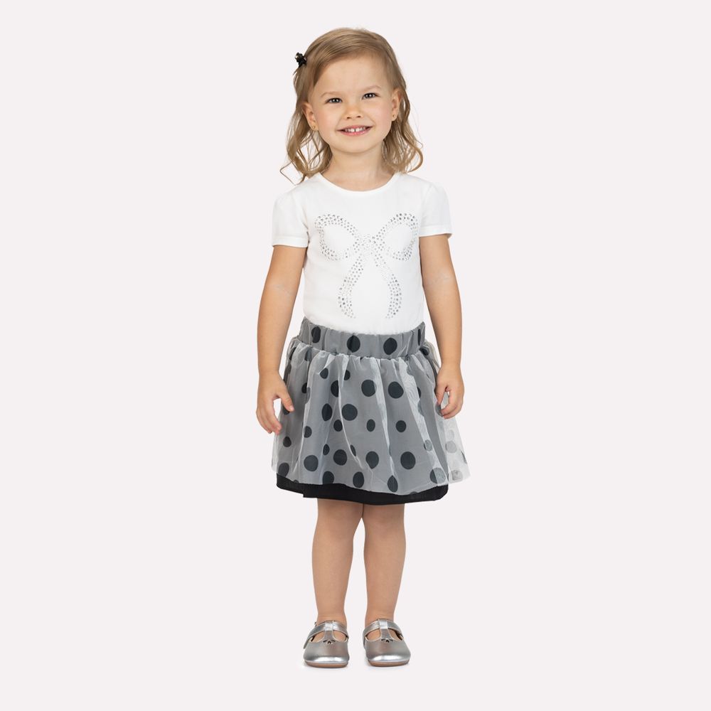 A parte inferior é uma saia em tule, confeccionada em 100% poliéster, com visual leve e elegante. A estampa de bolinhas traz um charme atemporal e lúdico, enquanto a modelagem evasê cria movimento fluido e gracioso. Para garantir conforto absoluto, a peça conta com forro da saia em 100% algodão e forro em formato de short em cotton, com 95% algodão e 5% elastano, proporcionando segurança, suavidade e liberdade para brincar. Um conjunto que une brilho discreto, conforto e modelagem delicada, ideal para ocasiões especiais ou para deixar o dia a dia ainda mais encantador.