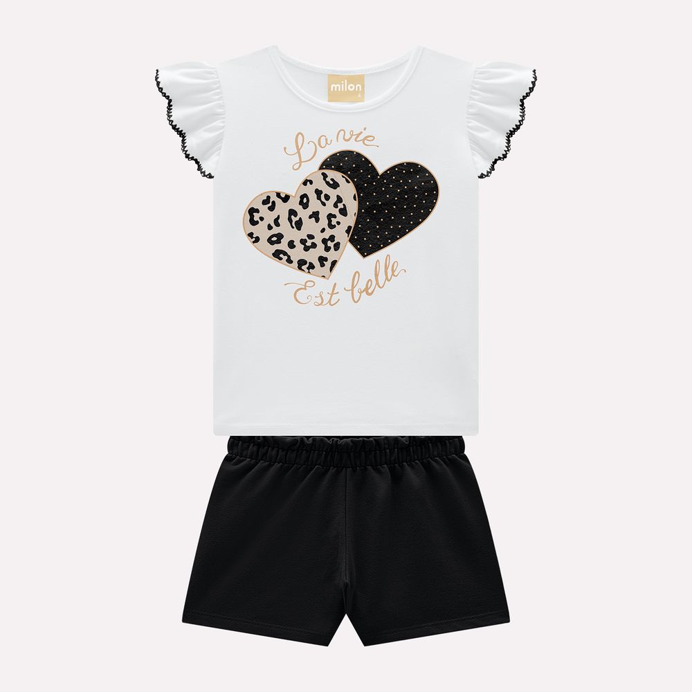 O conjunto infantil menina Milon é delicado, confortável e pensado para vestir a infância com leveza e charme em cada momento. A parte superior é uma blusa em cotton, confeccionada em 95% algodão e 5% elastano, oferecendo toque macio, elasticidade suave e excelente conforto ao longo do dia. A modelagem é levemente soltinha, proporcionando caimento delicado e liberdade de movimentos. As mangas com picueta acrescentam volume sutil e um acabamento gracioso, enquanto a estampa localizada de corações traz um visual doce e harmonioso, valorizando a peça com um toque encantador e bem posicionado.
