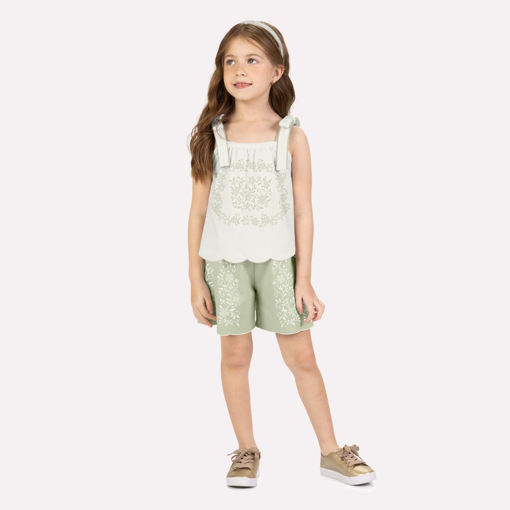 O short complementa o conjunto com perfeita harmonia. Produzido no mesmo cotton confortável, possui modelagem ampla que garante liberdade de movimento. A estampa localizada de folhagem conversa com a blusa de forma equilibrada, enquanto o cós com elástico oferece ajuste suave ao corpo. Em tom verde suave, este conjunto une modelagem confortável, estética natural e acabamentos sofisticados, ideal para composições delicadas e cheias de charme no dia a dia ou em ocasiões especiais.