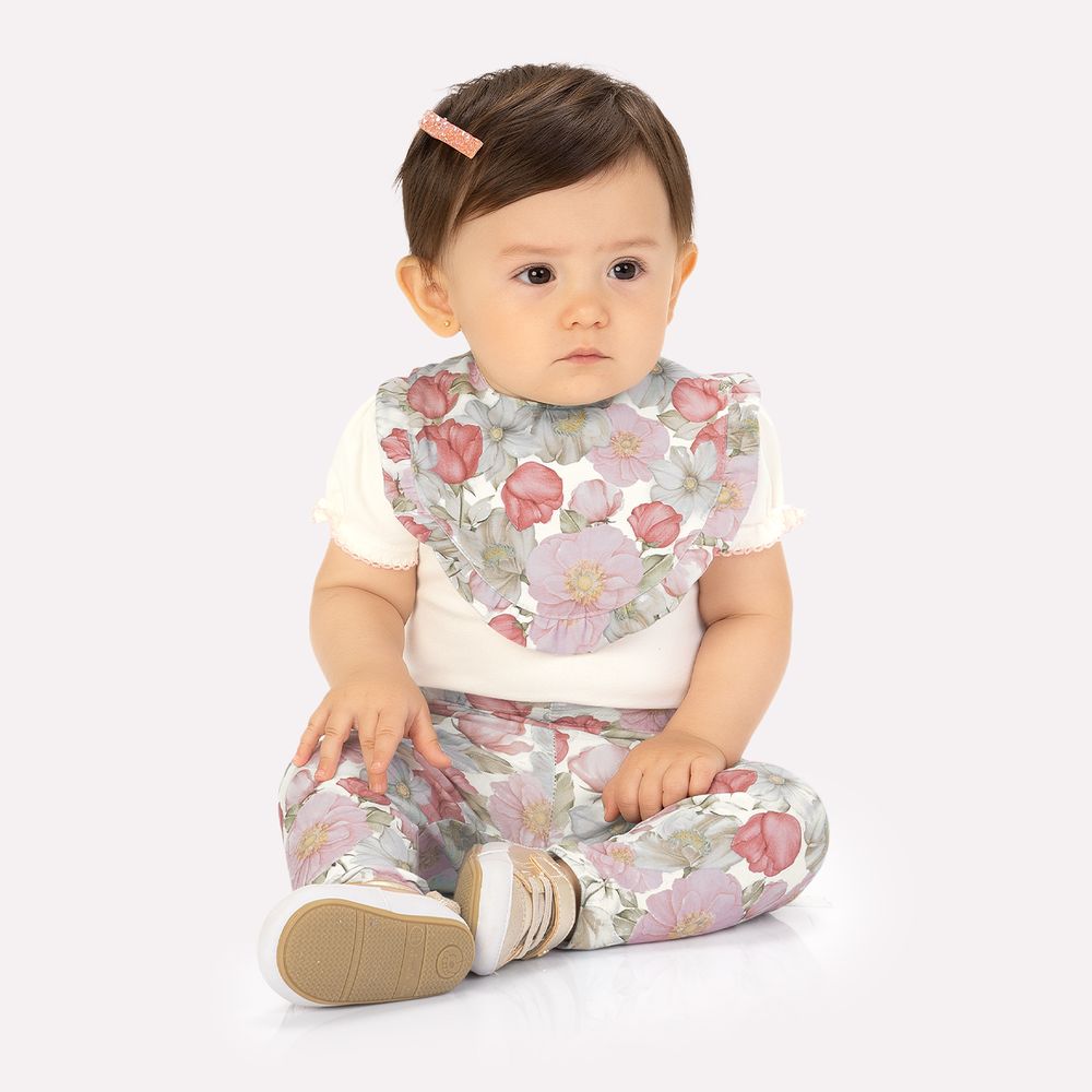 A calça, também em cotton, apresenta estampa rotativa de flores em tons suaves, harmonizando perfeitamente com o body. Sua modelagem ajustada garante liberdade de movimentos sem apertar, acompanhando cada passo da bebê. O conjunto é finalizado com um babador estampado com babadinhos na borda, que além de funcional, é um acessório que completa o visual com charme extra. Perfeito para passeios, encontros em família ou momentos especiais, este conjunto une conforto, delicadeza e a qualidade Milon em cada detalhe.