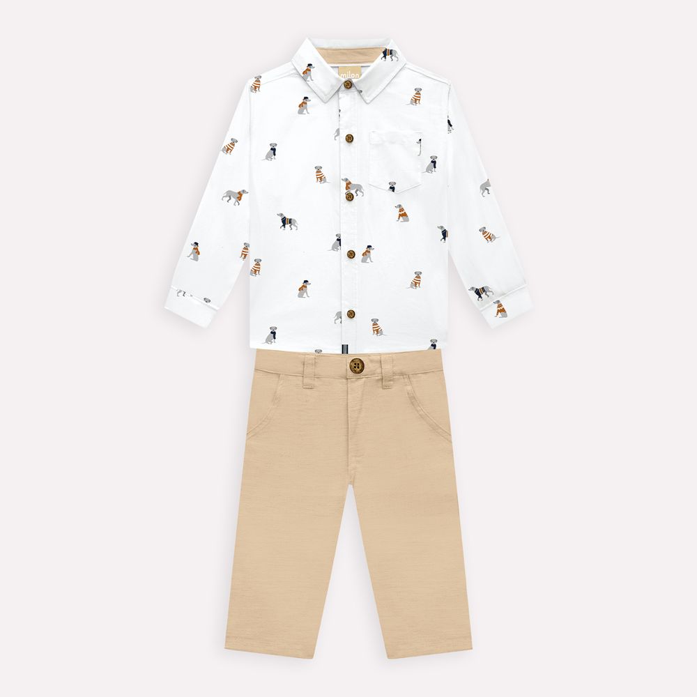 Charmoso e cheio de personalidade, o conjunto infantil menino Milon é ideal para ocasiões especiais que pedem um visual elegante, mas ainda confortável para os pequenos. A camisa é confeccionada em tricoline 100% algodão, tecido leve e respirável, ideal para garantir conforto durante todo o uso. Seu design clássico apresenta gola tradicional, abertura frontal por botões e um delicado bolso no peito. O destaque fica por conta da estampa de cachorrinhos, que adiciona um toque lúdico ao visual sem perder a elegância.