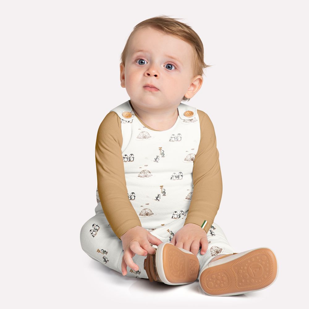 A peça principal é a jardineira, confeccionada em moletom peluciado 100% algodão. O forro interno, feito em uma mescla de 50% algodão e 50% poliéster, garante maior conforto e reforça a durabilidade da peça. O destaque fica por conta da estampa de pinguins, que adiciona um toque lúdico e irresistível ao visual, tornando o look ainda mais fofo e divertido. A abertura entrepernas com botões de pressão facilita as trocas de fralda, tornando a rotina mais prática para os pais e cuidadores.