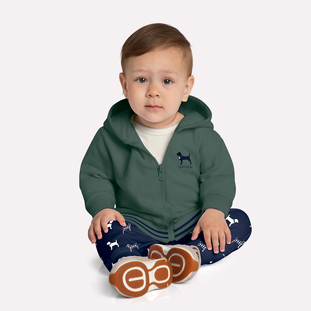 O casaco, confeccionado em 100% algodão, é a peça-chave do conjunto, oferecendo um visual aconchegante e sofisticado. O capuz adiciona um toque moderno e funcional, perfeito para proteger do frio e complementar o estilo da peça. O destaque especial fica por conta do bordado delicado de cachorrinho, um detalhe encantador que enriquece o visual e transmite toda a doçura do universo infantil. Além disso, o fechamento em zíper facilita o vestir, tornando a peça ainda mais prática.