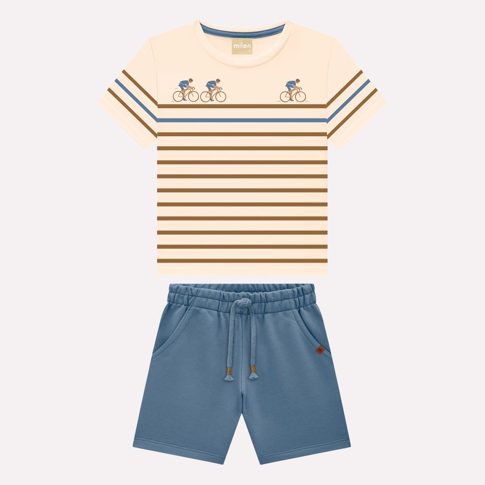 O conjunto infantil menino Milon é um look cheio de movimento e estilo, pensado para acompanhar os meninos em cada aventura com conforto e charme. A camiseta em meia malha 100% algodão é leve e macia, garantindo frescor nos dias mais ativos. Sua modelagem clássica com gola redonda proporciona ótimo caimento, enquanto o destaque fica para a estampa localizada de ciclistas que pedalam sobre as listras horizontais, criando um visual moderno e divertido, perfeito para estimular a imaginação dos pequenos.