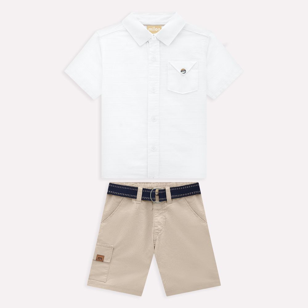 O conjunto infantil menino Milon combina sofisticação, conforto e detalhes que encantam. A camisa em tecido maquinetado 100% algodão possui textura refinada, modelagem clássica com gola, botões frontais e bolso com detalhe delicado, garantindo um visual arrumado e cheio de charme. O tom claro é versátil e elegante, perfeito para compor produções festivas.