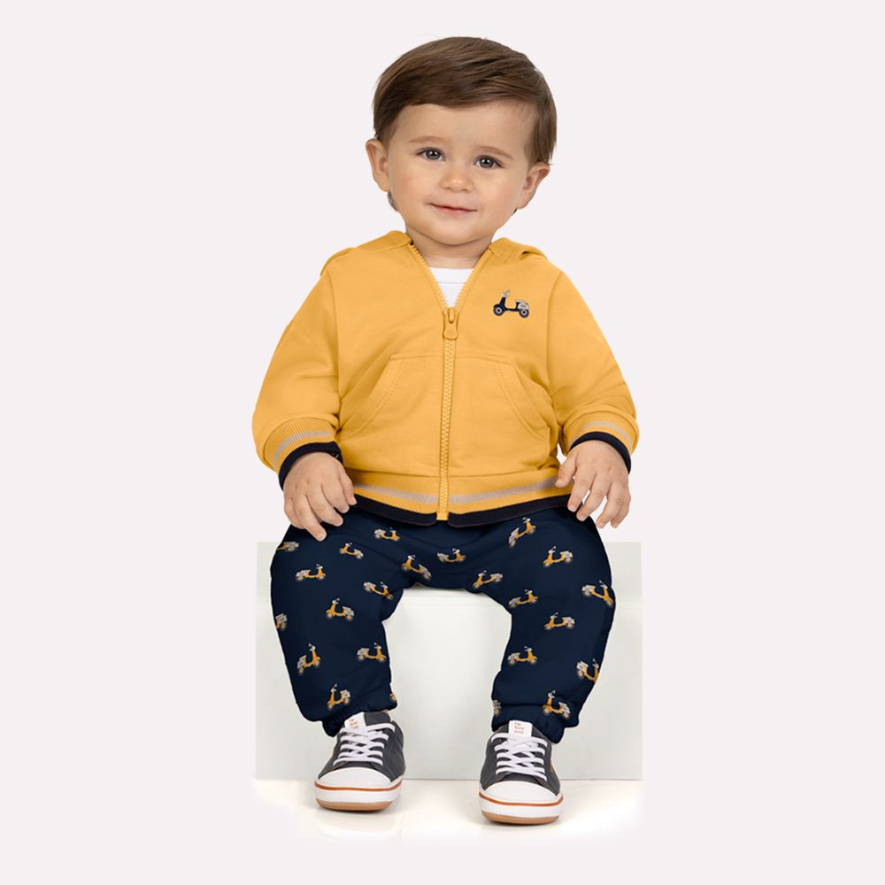 A jaqueta em moletom sem felpa 100% algodão conta com capuz, fechamento frontal em zíper e bolso estilo canguru. O destaque fica para o delicado bordado de scooter, que traz um detalhe divertido ao visual. A calça em moletom 100% algodão apresenta estampa rotativa de scooters, cós com elástico para melhor ajuste e punhos que garantem conforto e liberdade de movimento. Prático, confortável e cheio de estilo, o conjunto bebê menino Milon é ideal para compor looks casuais aconchegantes para o dia a dia.
