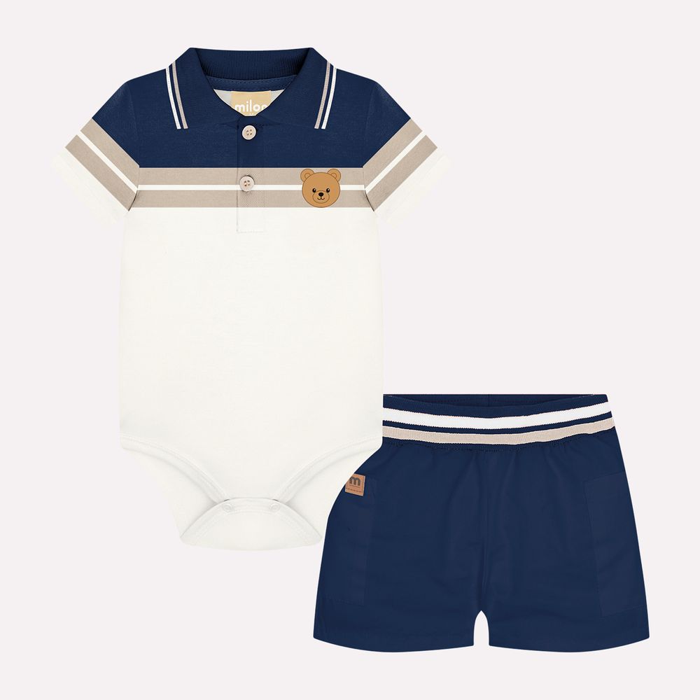 A parte superior é um body em cotton, confeccionado em 95% algodão e 5% elastano, oferecendo toque macio, excelente respirabilidade e elasticidade suave para acompanhar os movimentos do bebê. A modelagem é anatômica e confortável, com abertura prática entrepernas que facilita as trocas. O design tipo polo traz um visual elegante, com gola estruturada e acabamento cuidadoso. O destaque fica por conta da estampa de ursinho aplicada de forma delicada, acrescentando charme e um toque lúdico à peça sem perder a sofisticação.