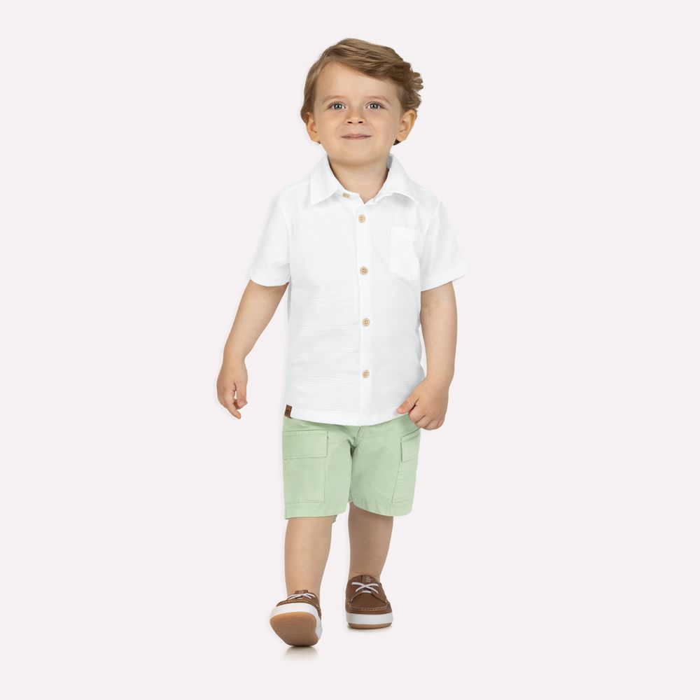 O conjunto infantil menino Milon traduz sofisticação na simplicidade, com design atemporal, tecidos de qualidade e acabamento impecável. A parte superior é composta por camisa em malha trabalhada, com composição de 50% algodão e 50% poliéster, que proporciona toque macio, leve textura e excelente caimento. A modelagem é confortável e bem estruturada, com mangas curtas, fechamento frontal por botões e bolso funcional que adiciona charme e praticidade. O visual clean valoriza a peça e permite composições versáteis, ideais para diversas ocasiões.