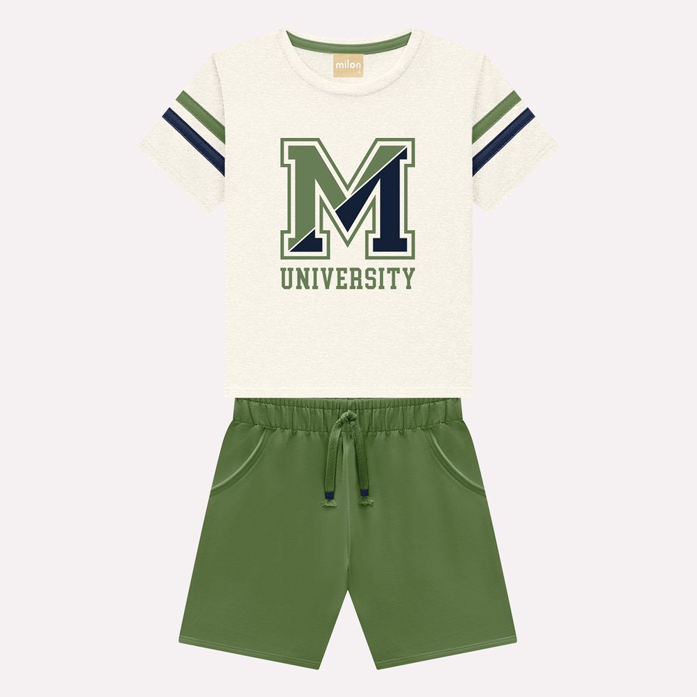 A parte superior é uma camiseta em meia malha, confeccionada em 100% algodão, oferecendo toque macio, excelente respirabilidade e conforto ao longo do dia. A modelagem é clássica, com caimento confortável ao corpo infantil. O destaque fica por conta da estampa localizada de lettering com inspiração urbana, aplicada de forma equilibrada e delicada, que confere personalidade ao visual. Os detalhes contrastantes nas mangas valorizam ainda mais o design, trazendo um acabamento sofisticado.