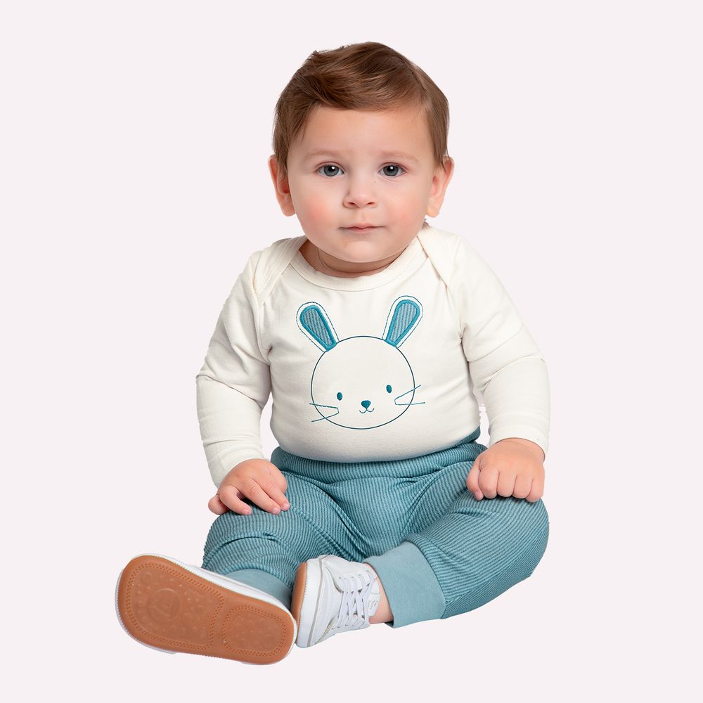 O body, confeccionado em 95% algodão e 5% elastano, proporciona um toque macio e elástico, perfeito para o bem-estar do bebê ao longo do dia. O grande destaque fica por conta do bordado encantador de um coelhinho, trazendo um toque lúdico e delicado à peça. Além disso, o fechamento por botões entre as pernas facilita a troca, oferecendo mais praticidade para o dia a dia dos pais e conforto para o pequeno.
