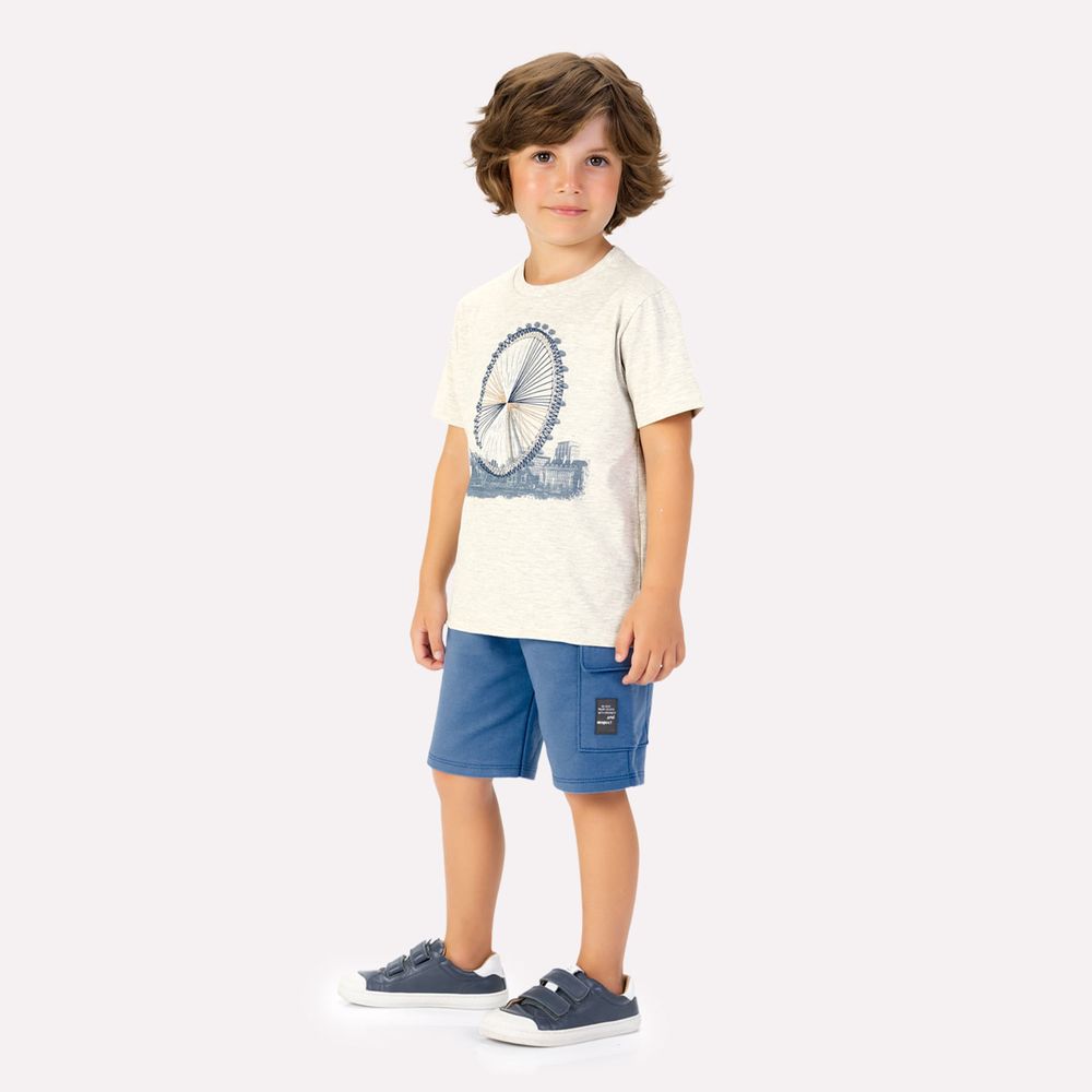 A camiseta, confeccionada em meia malha 98% algodão e 2% poliéster, tem caimento leve e macio, perfeito para acompanhar os movimentos da criança ao longo do dia. O destaque fica por conta da estampa localizada de uma roda gigante, que simboliza diversão e magia, além do detalhe em bordado que dá um ar sofisticado à peça. O design moderno, aliado à gola confortável e à modelagem soltinha, torna a camiseta ideal para os dias cheios de brincadeiras.