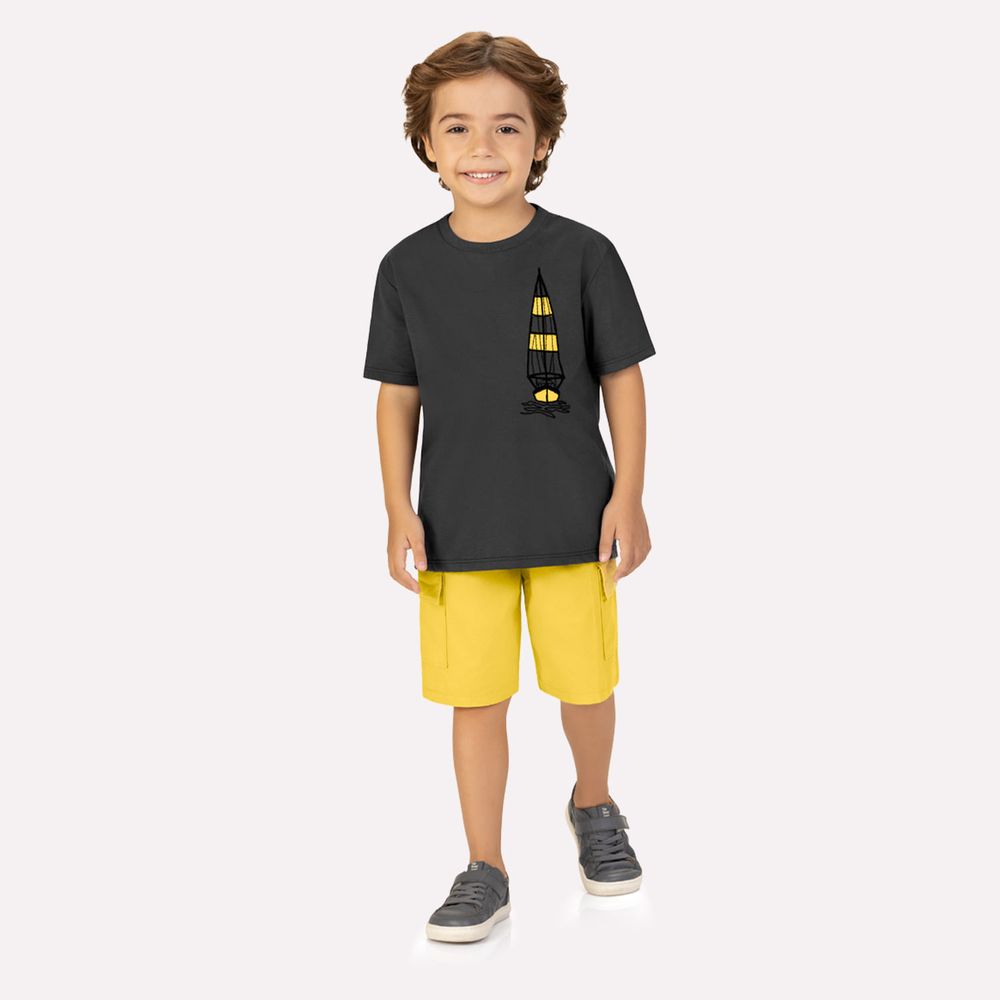 Combinando perfeitamente, a bermuda em sarja leve 100% algodão proporciona liberdade de movimentos e praticidade. A peça conta com bolsos funcionais, ideais para dar mais estilo e utilidade, além do cós elástico com cordão ajustável que assegura conforto e ótimo caimento. O tom vibrante da bermuda contrasta com a camiseta, deixando o look moderno e cheio de personalidade. Um conjunto versátil, divertido e elegante, perfeito para meninos que adoram explorar e brincar com muito estilo.