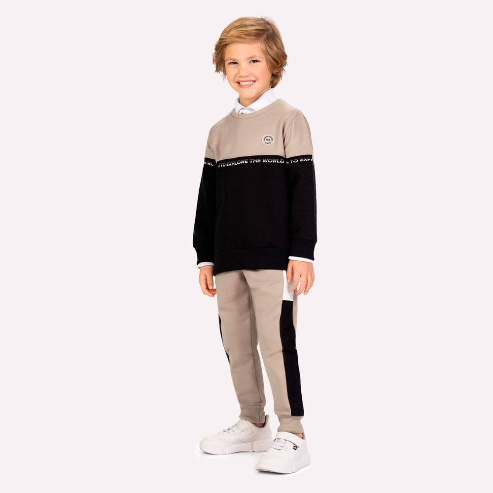 O conjunto infantil menino Milon combina conforto, estilo e personalidade em uma proposta moderna para os dias mais frescos. A blusa é confeccionada em moletom peluciado 100% algodão, proporcionando toque macio, aquecimento na medida certa e excelente respirabilidade para o uso cotidiano. A modelagem confortável valoriza o caimento no corpo, permitindo liberdade de movimento para acompanhar cada descoberta do dia. O design em blocos de cor entre bege e preto cria um visual contemporâneo e marcante. Na parte frontal, a estampa localizada com lettering “Born to explore the world” reforça o espírito explorador da peça, enquanto o detalhe termocolante aplicado no peito acrescenta textura e sofisticação ao acabamento. As mangas recebem aplicação de faixas com lettering, trazendo um toque urbano e moderno ao visual.