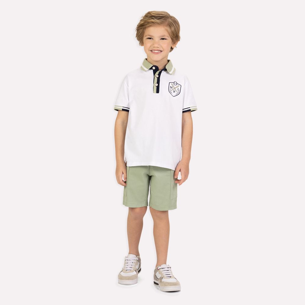 Clássico cheio de charme, o conjunto infantil menino Milon traduz elegância casual e conforto em uma proposta atemporal, ideal para acompanhar os meninos em diversas ocasiões. A camisa polo é confeccionada em meia malha 100% algodão, oferecendo toque macio, respirabilidade e excelente conforto ao vestir. A modelagem tradicional garante caimento impecável, enquanto o acabamento da gola e dos punhos adiciona um ar refinado à peça. O bordado localizado no peito traz identidade e sofisticação ao visual, valorizando a camisa com um detalhe discreto e elegante.
