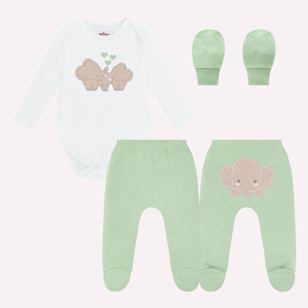 A parte inferior apresenta modelagem anatômica, pensada para acompanhar os movimentos naturais do bebê com suavidade. O cós com elástico garante ajuste seguro e confortável, sem apertar. O destaque fica por conta da estampa localizada de elefantinho aplicada no bumbum, que acrescenta um toque lúdico e irresistível à peça. O acabamento com pezinho mantém o bebê aquecido e protegido, ideal para o dia a dia. O conjunto acompanha luvinhas, que completam o look com funcionalidade e cuidado, ajudando a manter o bebê aquecido e protegido nos primeiros meses. Um conjunto delicado, confortável e cheio de afeto, traduzindo a qualidade e o cuidado característicos da Milon, perfeito para vestir momentos especiais com suavidade e amor.