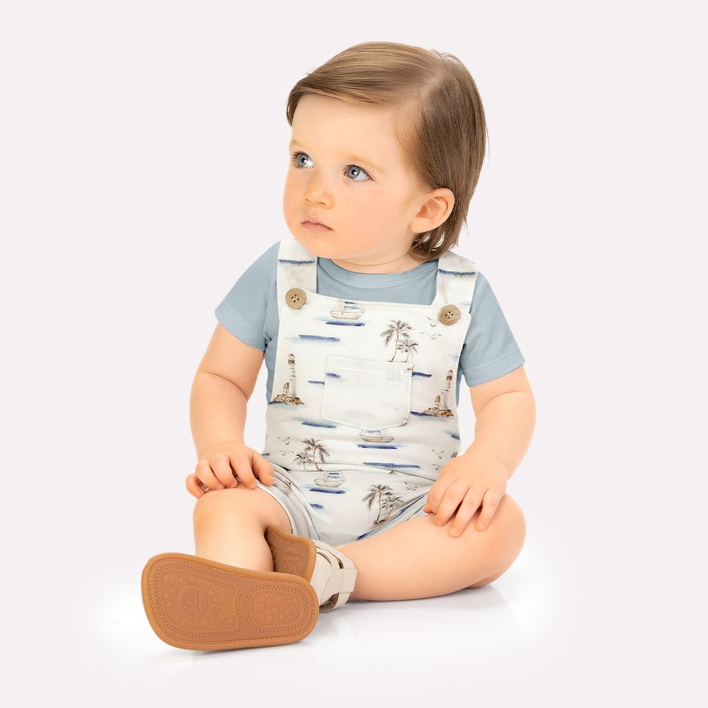 A jardineira, confeccionada em moletom sem felpa 100% algodão, proporciona caimento leve e confortável. Seu design clássico com alças ajustáveis e botões frontais facilita o vestir, enquanto o bolso aplicado na parte frontal traz funcionalidade e charme. O destaque fica para a estampa rotativa digital com faróis, barcos e palmeiras, que traduz o clima praiano de forma alegre e sofisticada. O detalhe termocolante complementa a peça com um toque moderno. Um conjunto encantador, que une a suavidade dos tecidos à beleza dos detalhes, ideal para vestir o pequeno com estilo e conforto em qualquer ocasião.