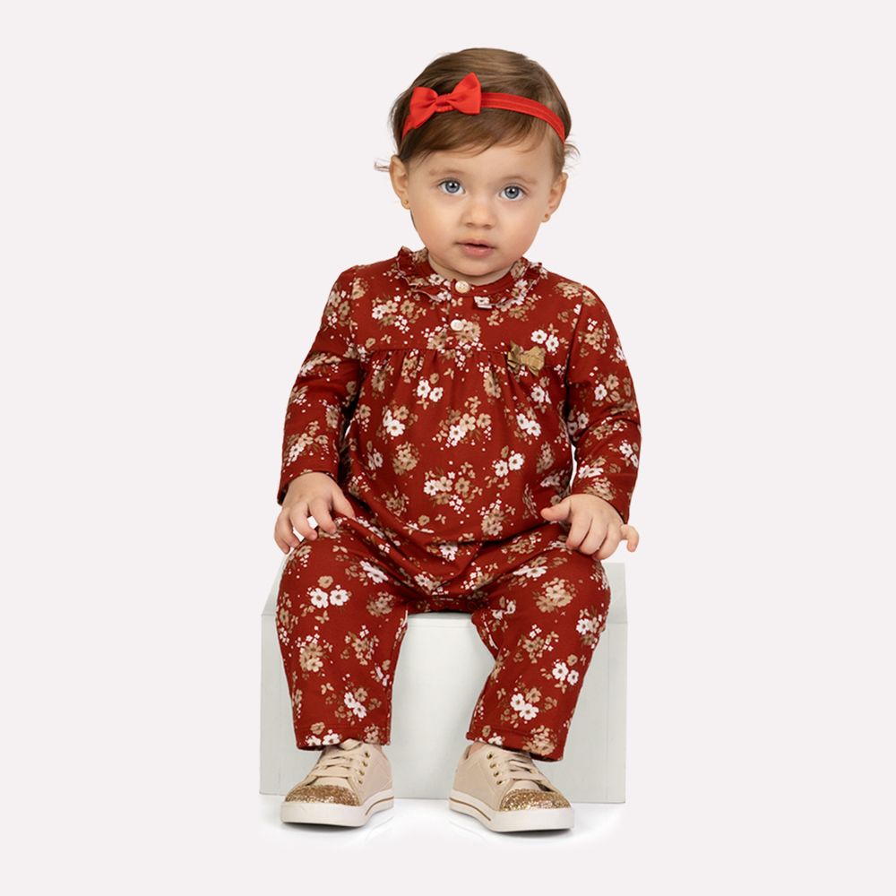 Confeccionado em suedine 100% algodão, o macacão oferece toque extremamente macio, respirabilidade e conforto ideal para a pele sensível do bebê. A modelagem confortável acompanha os movimentos com leveza, proporcionando liberdade para o dia a dia. A peça recebe estampa rotativa com delicada estampa de flores em tons suaves, criando uma composição romântica e sofisticada inspirada na natureza. O recorte na altura do peito com leve franzido acrescenta movimento e charme ao visual, enquanto a gola delicadamente trabalhada valoriza o acabamento da peça. O destaque fica por conta do pequeno laço aplicado no peito, que adiciona um toque gracioso e feminino ao design.