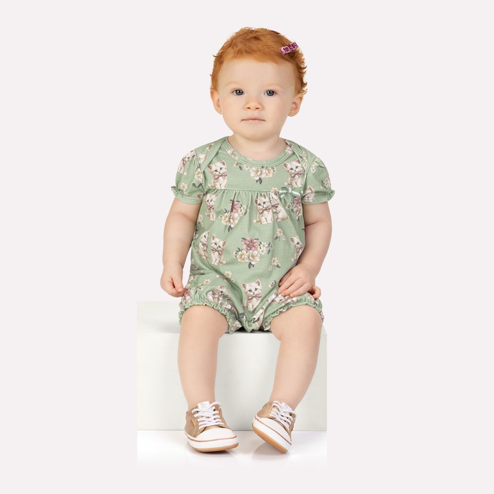 A modelagem é prática, com abertura entrepernas em botões de pressão que facilita as trocas, mangas curtas para deixar o visual leve e franzidos delicados no peitinho, que garantem caimento gracioso. O grande destaque fica para a estampa rotativa de gatinhos e flores, que traz um ar lúdico e encantador, deixando a peça ainda mais fofa. Detalhes como o laço aplicado completa o visual com um toque sofisticado. Um look cheio de ternura e estilo, perfeito para deixar sua bebê confortável e encantadora em qualquer ocasião.