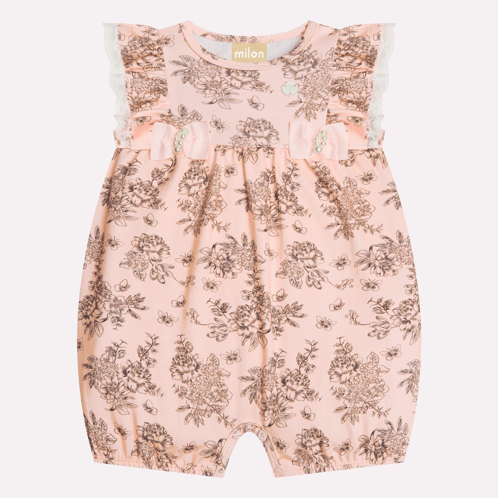 A estampa rotativa de flores cria um visual encantador, harmonizando com os laços aplicados na cintura que deixam o look ainda mais gracioso. Para completar, a peça recebe a tradicional plaquinha Milon, símbolo de sofisticação e autenticidade. A abertura entrepernas com botões de pressão facilita as trocas, tornando o macaquinho prático para o dia a dia. Um look delicado, confortável e elegante, pensado para deixar sua bebê ainda mais fofa em todas as ocasiões.