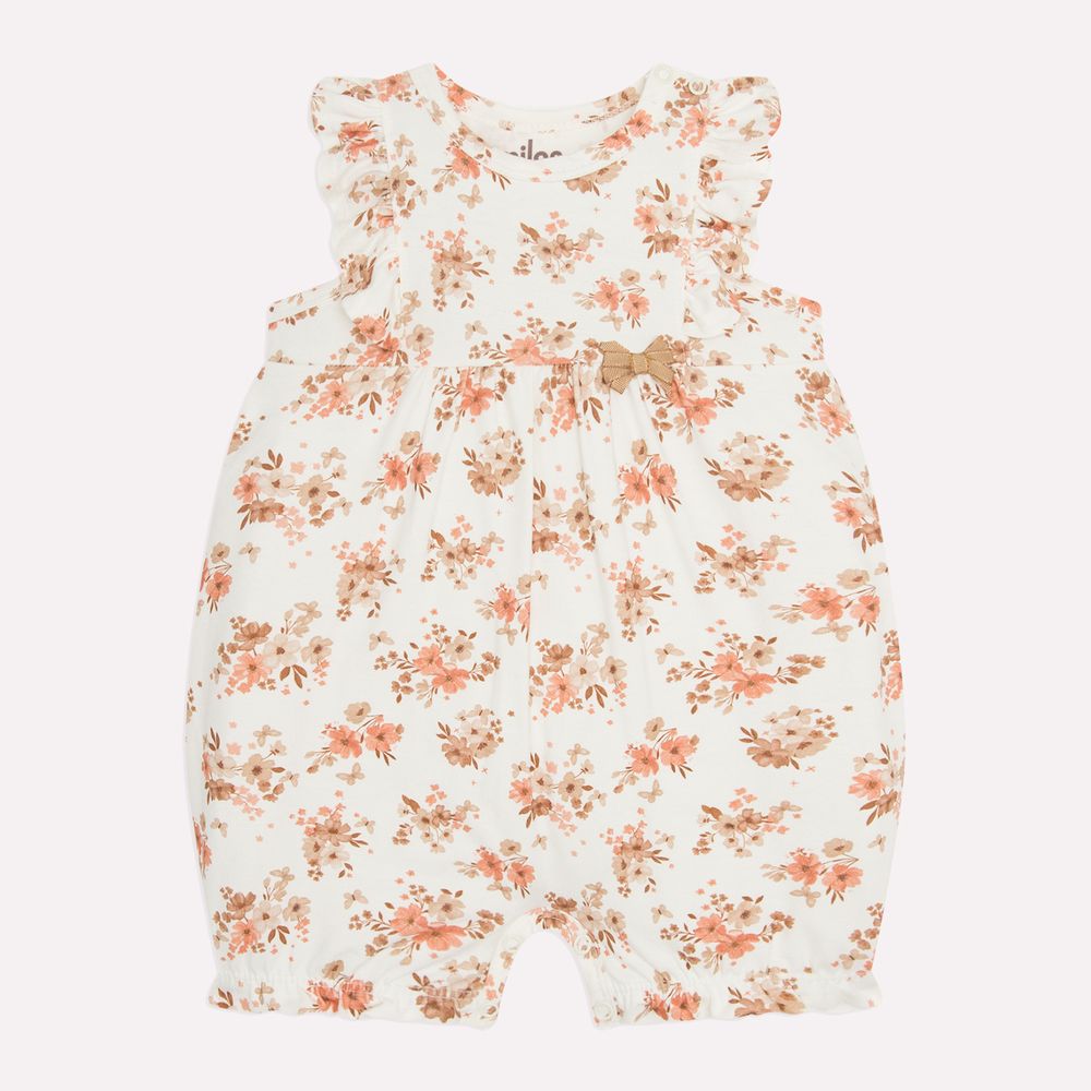 A estampa rotativa de flores aparece de forma harmoniosa por toda a peça, criando um visual delicado e atemporal. O laço aplicado na parte frontal acrescenta um detalhe sutil e sofisticado, reforçando o charme da peça com suavidade. Um macaquinho ideal para acompanhar o bebê com conforto e elegância, perfeito para momentos especiais ou para o dia a dia com muito carinho.
