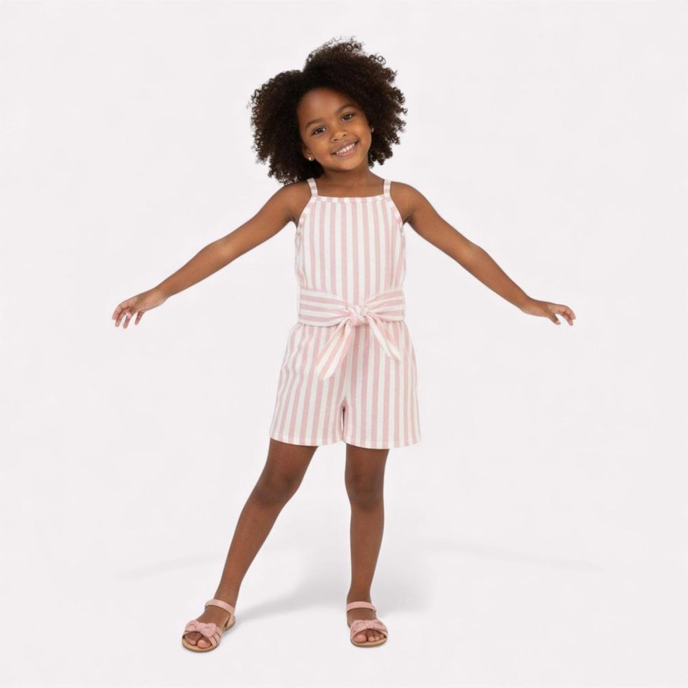 O modelo apresenta alcinhas finas, franzido no decote, amarração frontal em nó e recorte duplo nas laterais, que valorizam o caimento. A estampa listrada clássica traz sofisticação e um toque elegante ao look das pequenas, tornando a peça perfeita para dias ensolarados e momentos especiais.