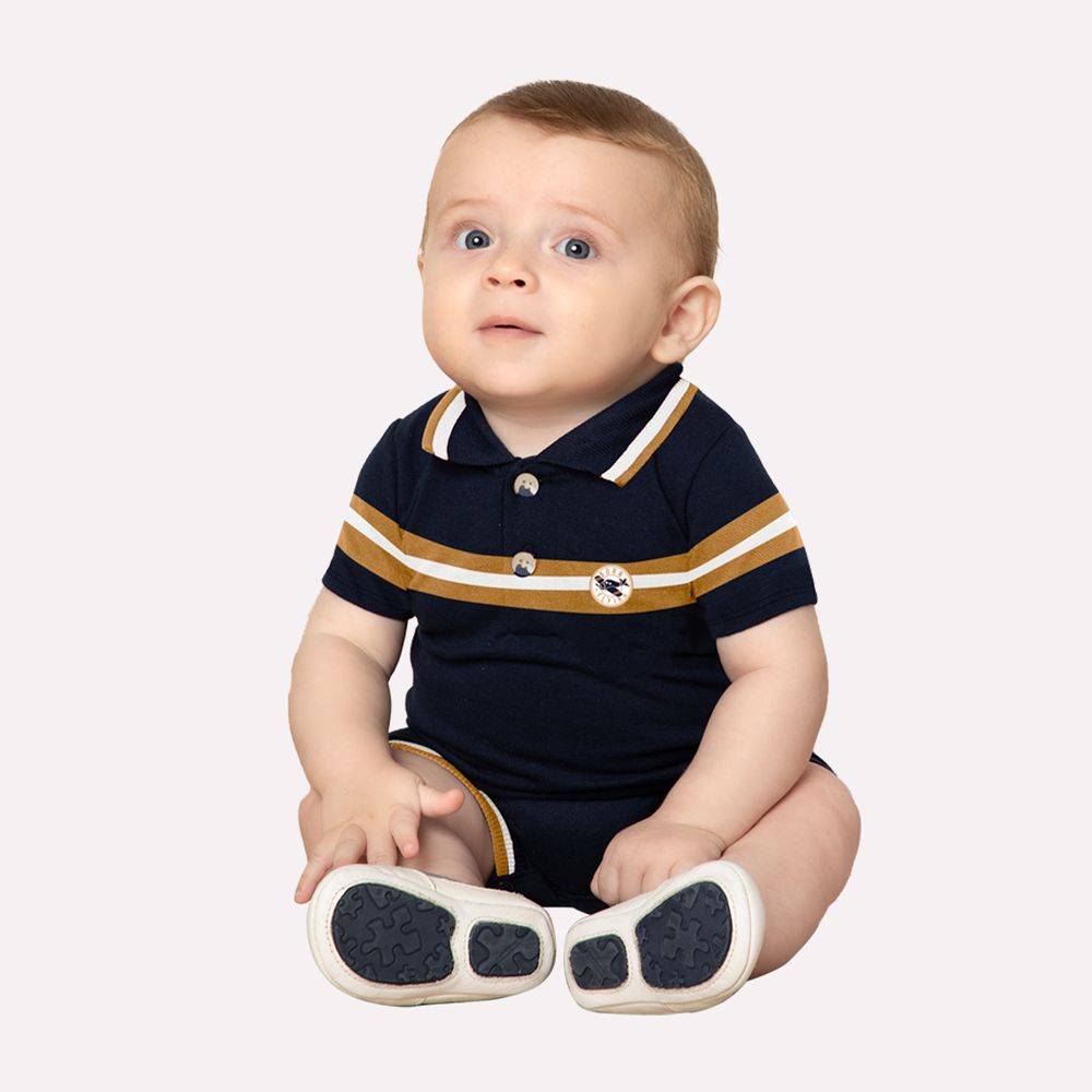 Confeccionado em cotton (95% algodão e 5% elastano), o tecido é macio, leve e elástico, proporcionando total conforto e liberdade de movimento para o bebê. Sua modelagem tipo polo adiciona um ar elegante e moderno, com gola retilínea e abertura frontal com botões, facilitando o vestir.