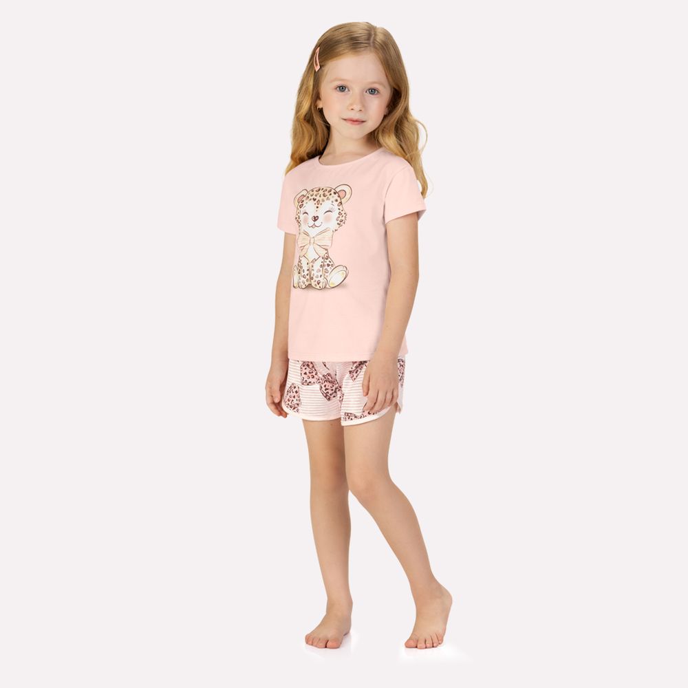 A blusa conta com modelagem soltinha, gola redonda e estampa exclusiva de uma oncinha delicada com laço, que brilha no escuro e traz um toque lúdico que encanta. Já o short completa o conjunto com cós elástico confortável e estampa rotativa de laços sobre listras, garantindo liberdade de movimentos e um visual moderno e gracioso.
