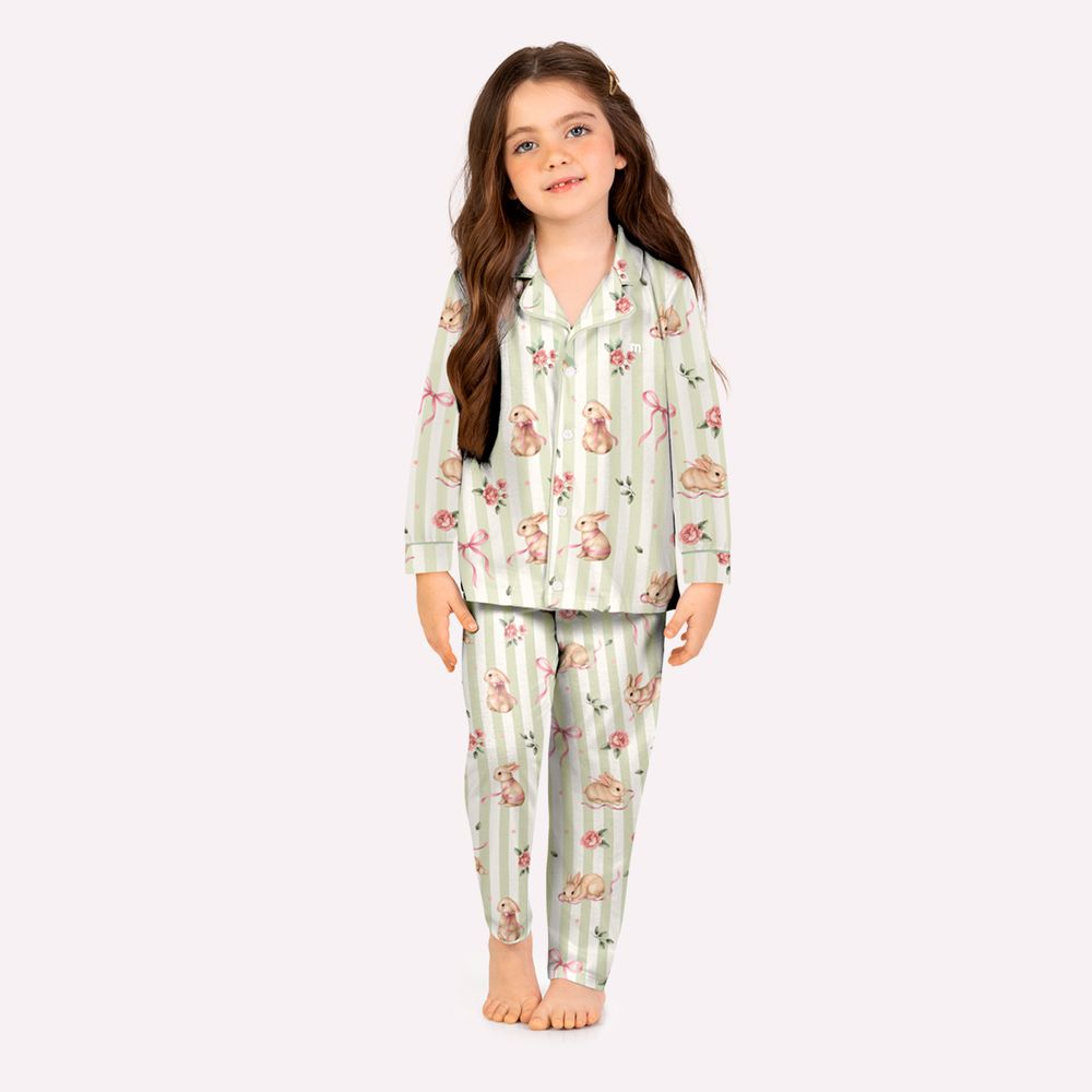 O pijama infantil meninai Milon envolve a infância em conforto, delicadeza e um visual encantador, perfeito para noites tranquilas e momentos especiais. Confeccionado em meia malha 100% algodão, o conjunto oferece toque extremamente macio, excelente respirabilidade e conforto térmico ideal para o descanso. A camisa segue o clássico modelo de pijama americano, com abertura frontal funcional e botões delicadamente aplicados, facilitando o vestir. A modelagem reta garante caimento confortável, enquanto o acabamento refinado valoriza cada detalhe da peça. A estampa rotativa de coelhinhos, listras e elementos delicados cria uma composição suave e sofisticada, enriquecida por um termocolante temático que adiciona charme e personalidade.