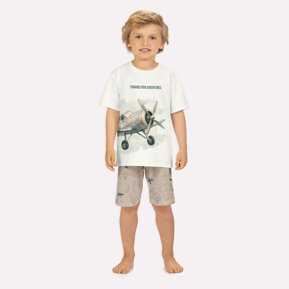 A bermuda complementa o conjunto com equilíbrio e harmonia, apresenta estampa de mapa com elementos de viagem, reforçando o tema aventureiro. Sua modelagem confortável conta com cós elástico, oferecendo ajuste suave ao corpo e liberdade de movimento durante o descanso. Um pijama pensado para proporcionar noites aconchegantes, com design delicado, acabamento cuidadoso e detalhes que fazem toda a diferença.