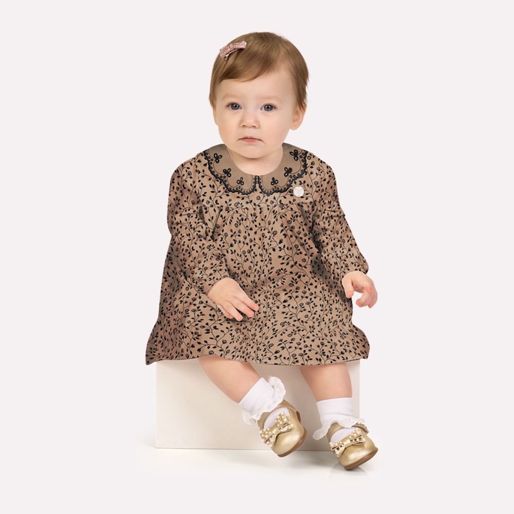 O vestido é confeccionado em tecido 100% algodão, proporcionando toque macio, respirabilidade e extremo conforto para a pele sensível do bebê. A modelagem soltinha apresenta caimento leve e delicado, com franzido na região do busto que cria movimento suave e valoriza a silhueta com naturalidade. A peça recebe estampa rotativa com delicada estampa de flores, inspirada na natureza, que reforça o visual romântico e sofisticado. O destaque fica por conta do bordado no peito, que acrescenta um acabamento artesanal e elegante, acompanhado de plaquinha aplicada que valoriza ainda mais o design. As mangas longas completam o visual com charme, mantendo a proposta confortável e refinada.