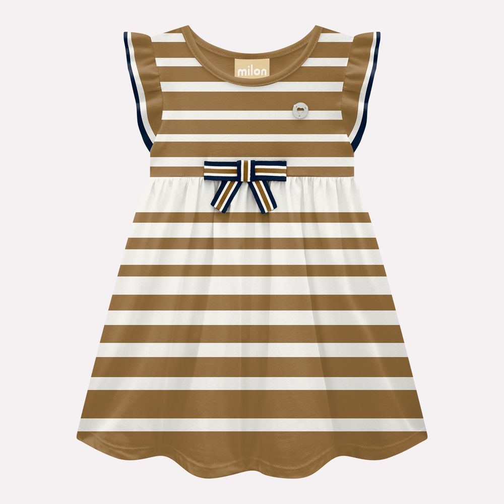 Sua modelagem evasê confere um caimento leve e fluido à saia, criando um visual gracioso e soltinho que encanta à primeira vista. As mangas franzidas adicionam um toque lúdico e delicado, enquanto o laço frontal com estampa de listras traz charme e feminilidade à peça. O detalhe final fica por conta da plaquinha personalizada Milon, que reforça a exclusividade e o cuidado em cada acabamento.